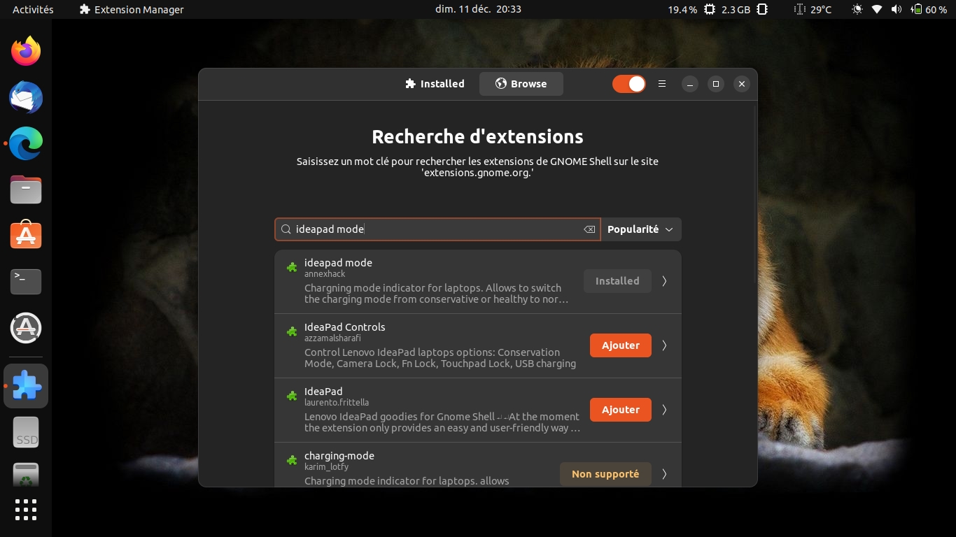 sudo apt install gnome-shell-extension-managerEnsuite tu lances l'application "extension manager" et tu vas sur l'onglet "browse" et tu recherches "ideapad mode" et tu auras ton extension pour le mode conservation.