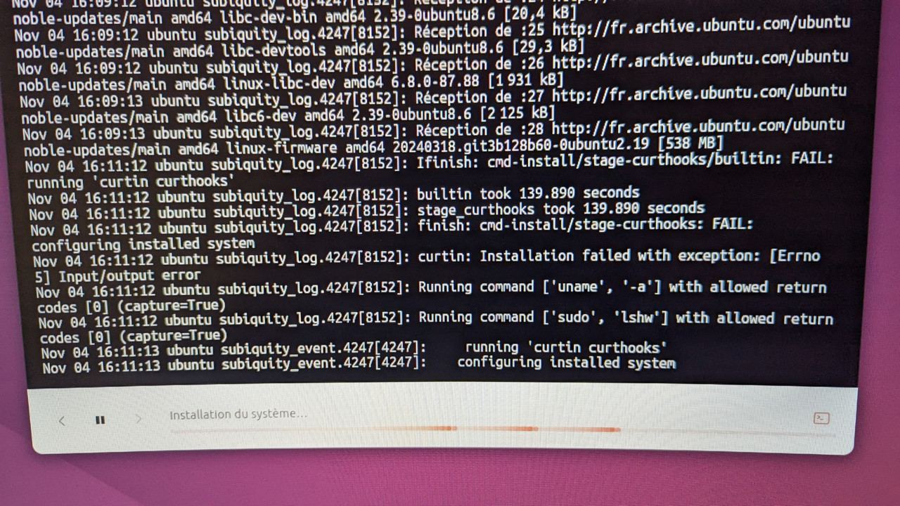 Là je retente le coup et je regarde le terminal , au début tout va bien puis ca tourne dans le vide ... et je vois que visiblement l'insaller ne peut se connecter à http://fr.archive.ubuntu.com alors que au début de l'installation pas de soucis.
